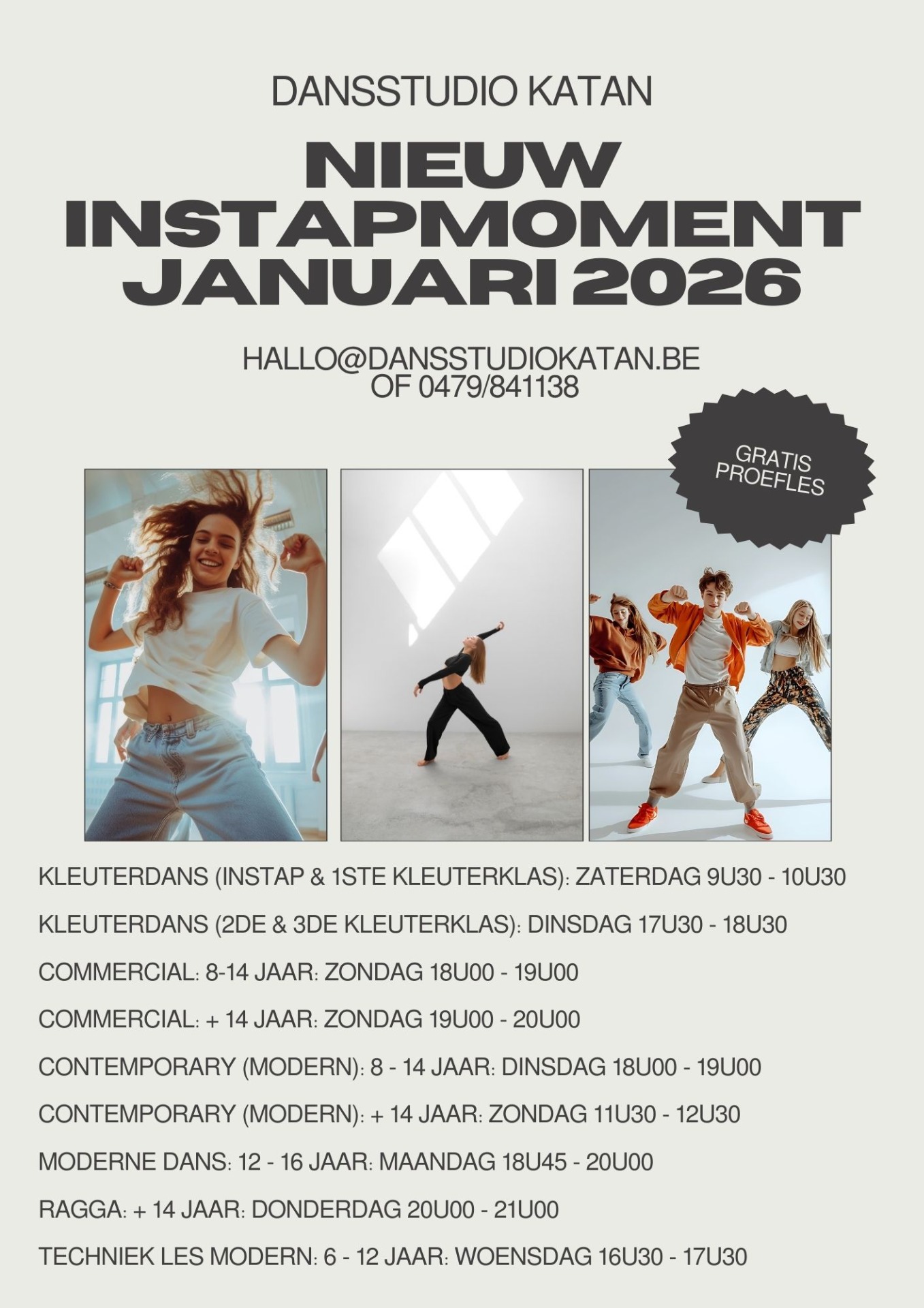 Na vele jaren op de Grote Baan zijn we verhuisd naar een gloednieuwe plek – en dat willen we samen met jullie vieren! ✨ Kom onze nieuwe dansstudio ontdekken en geniet van een gezellige dag vol plezier: een feestelijke receptie, springkasteel, hapjes & drankjes, ... Ook kan je al even komen meedansen in onderstaande workshops en kan je alvast je trui of t-shirt voor het komende seizoen aankopen.